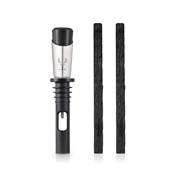 Oak aging provides the unique color, flavor and aroma that we associate with fine spirits. The Alchemi Liquor Aging Kit works by exposing smaller amounts of liquor to a larger charred American oak surface area to improve flavors by rounding out harsh notes. Unlike other infusion sticks, the Alchemi Liquor Aging Kit holds oak in suspension. This means you can easily remove the oak stick instead of leaving it sitting at the bottom of a bottle. When you achieve the perfect flavor, remove the aging stick with one simple step. Charred American oak creates a noticeably smoother, cleaner taste over just a few weeks. Connoisseurs will love comparing aged liquor side-by-side with un-aged to taste the difference. The stopper-pourer also elevates the presentation of any bottle.