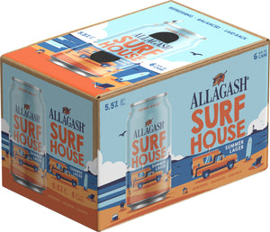 Allagash Surf House is described as a crisp and drinkable lager with subtle tropical notes due to its dry-hopping.
