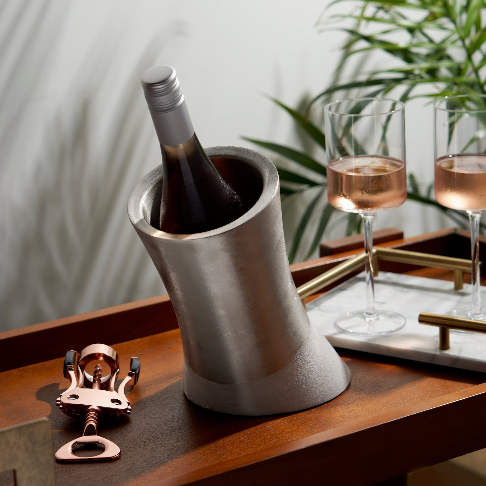 Angled and contoured to showcase wine with museum-worthy panache, our gleaming stainless steel bottle chiller is double-walled for full insulation and holds one standard bottle of white wine or bubbly until you're ready to pop the cork.