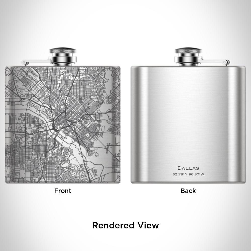 Custom engraved map of Dallas, Texas and coordinates on 6oz hip flask. Includes canvas bag and funnel. Map and inscription can be customized. Weight - 0.4lbs. Measurement - 5in x 1in x 4in.