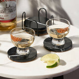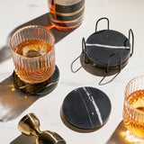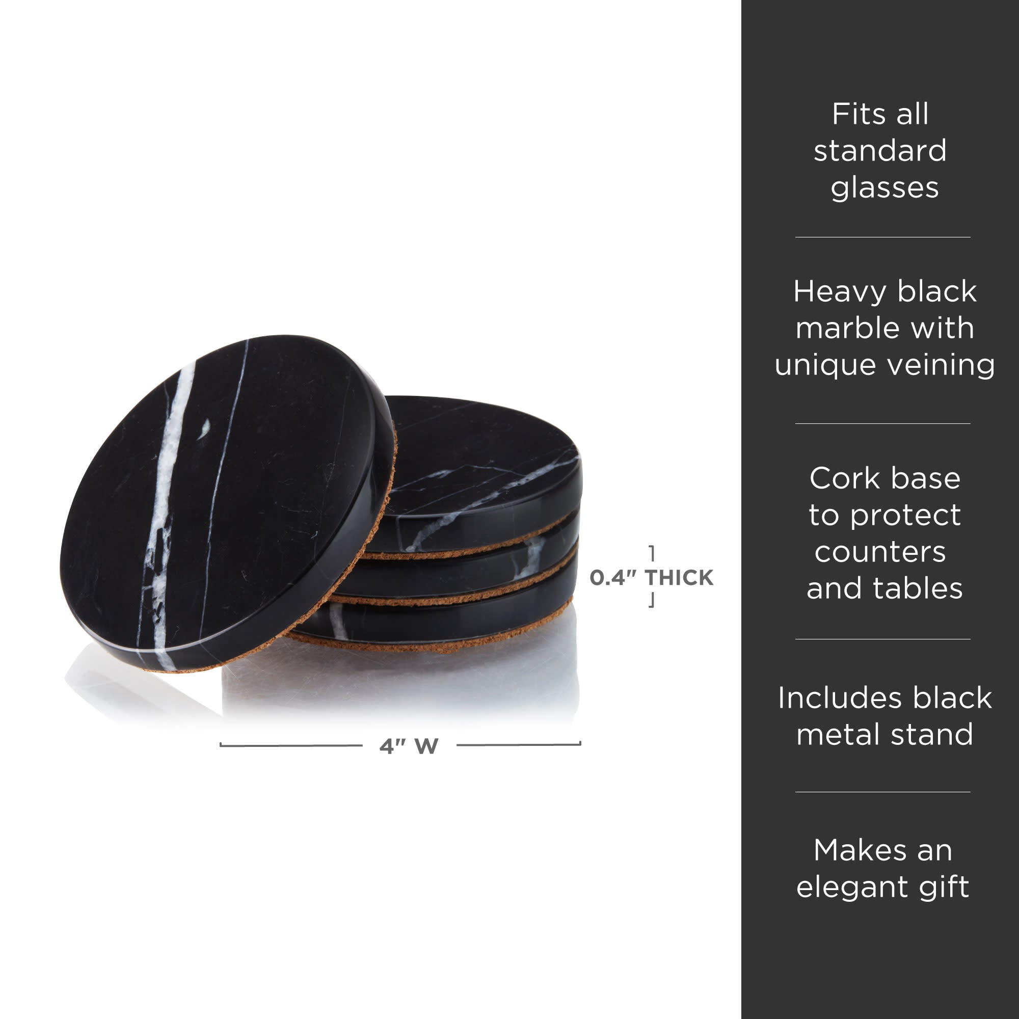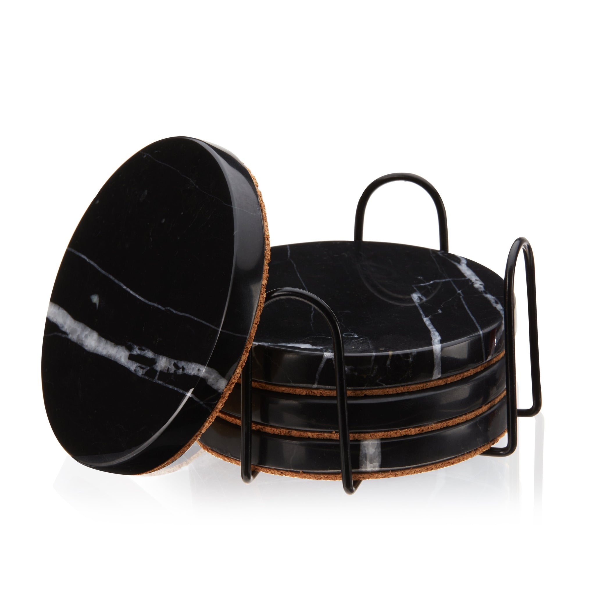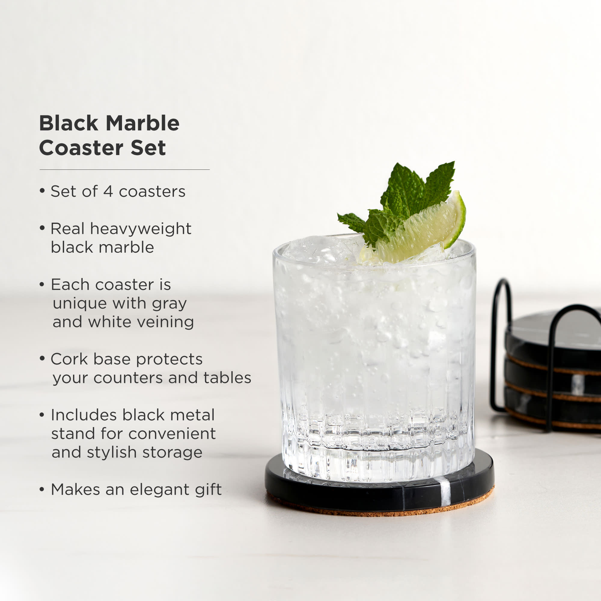 Real black marble threaded with gray and white veining makes these coasters an eye-catching addition to your home decor. Complete with a black stand and cork backing to protect surfaces, it’s a regal place to set down your favorite cocktails.