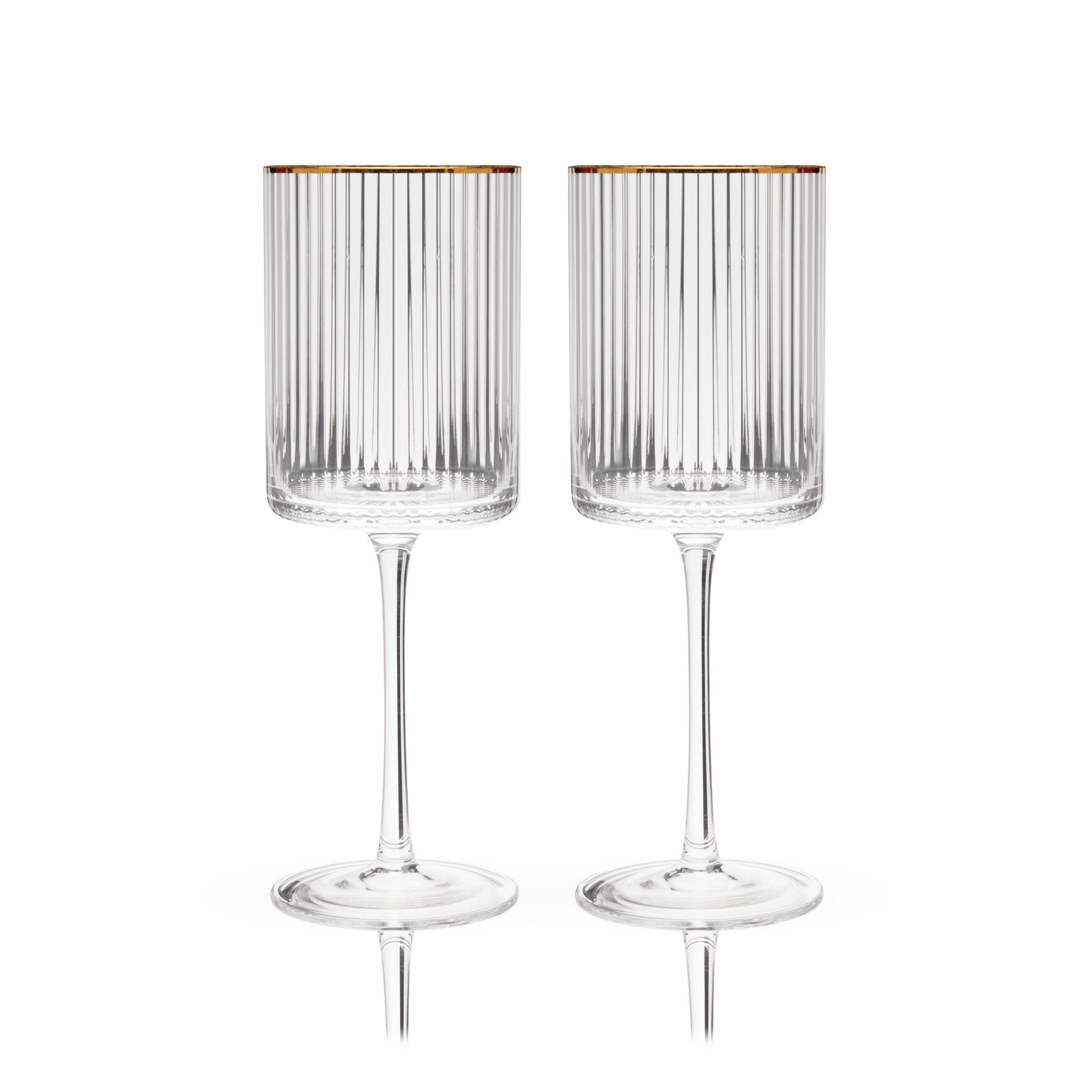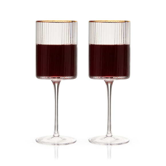 Enjoy red or white wine from these stemmed wine glasses. Crafted from sparkling lead-free crystal, they feature a unique rippled texture and gold-dipped rims inspired by the geometric elegance of Art Deco architecture.