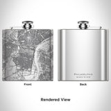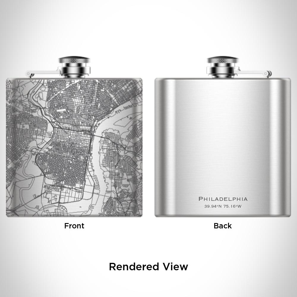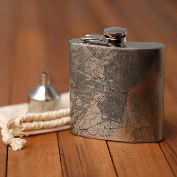 Custom engraved map of Philadelphia, Pennsylvania and coordinates on 6oz hip flask. Includes canvas bag and funnel. Map and inscription can be customized. Weight - 0.4lbs. Measurement - 5in x 1in x 4in.