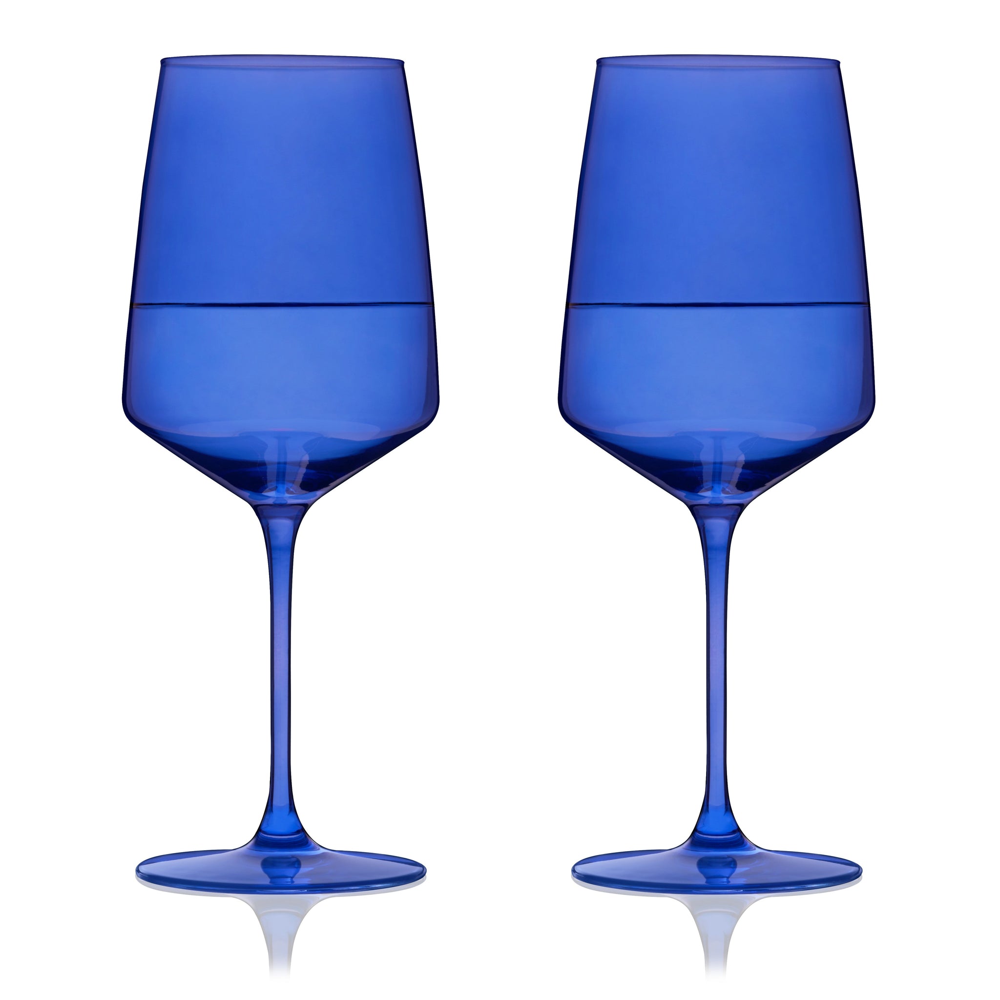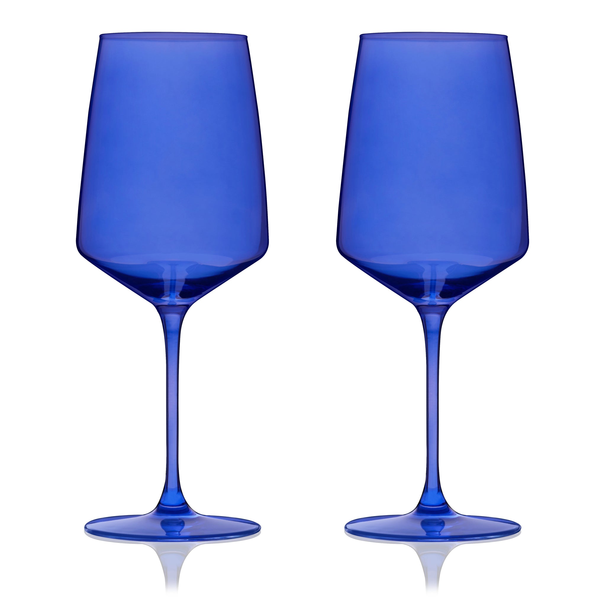 Enjoy your wine in gorgeous blue wine glasses. Crafted from European crystal, these stemmed wine glasses have a modern, angled silhouette with elegant stems and a striking ultramarine hue.