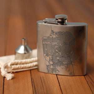 Custom engraved map of San Francisco, California and coordinates on 6oz hip flask. Includes canvas bag and funnel. Map and inscription can be customized. Weight - 0.4lbs. Measurement - 5in x 1in x 4in.