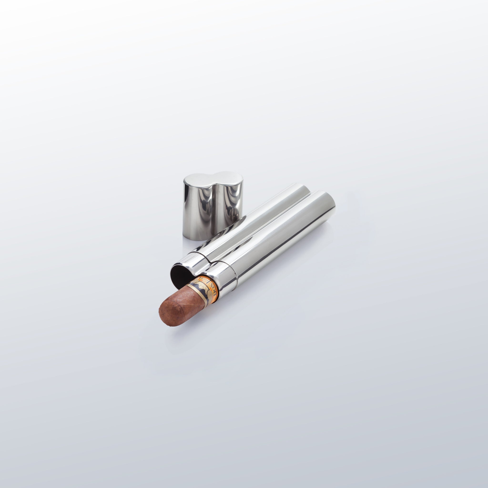 Keep two cigars in a classic 52-gauge stainless steel case to have them close at hand at any opportune moment. Opening the cap releases the rich, leathery aroma of hand-rolled tobacco within.
