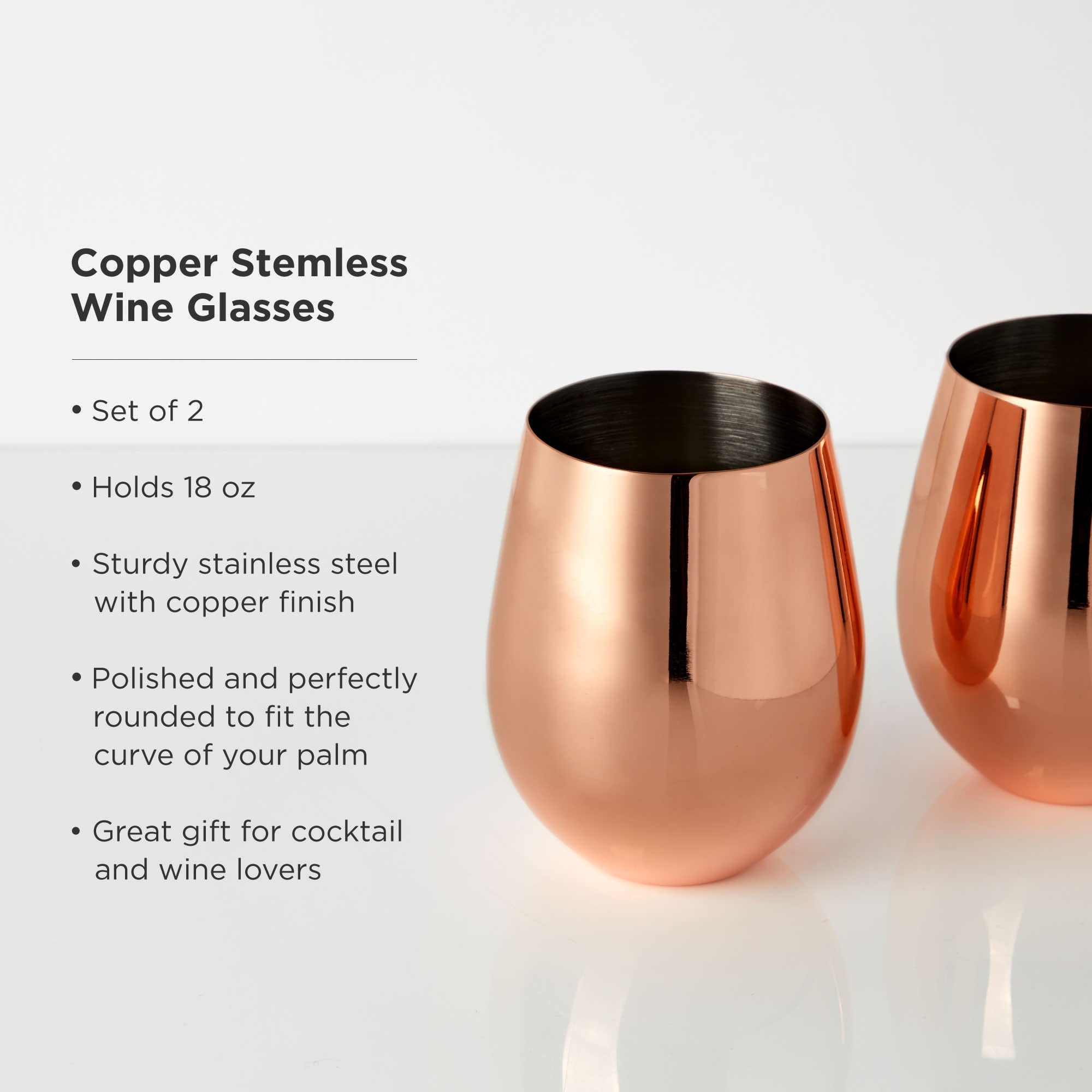Savor Sauvignon Blanc and Chardonnay from an eye-catching pair of stemless copper tumblers. Each polished and perfectly rounded to fit the curve of your palm, these mirror-finished metal glasses collect and intensify the aromas of your drink for an appetizing taste every time.